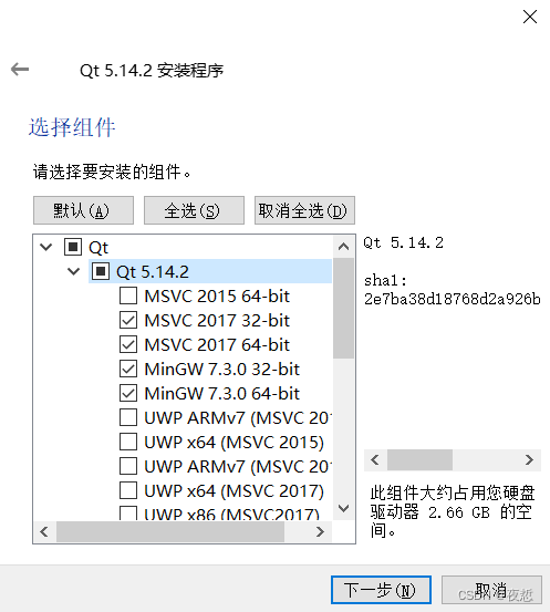 - 勾选相应组件(需要搭配Visual Studio使用需勾选MSVC…;MinGW是Windows操作系统下的C语言编译器库;若不清楚位数建议32、64位都勾选;若清楚并有对其他组件的需求可自定义勾选其他组件)